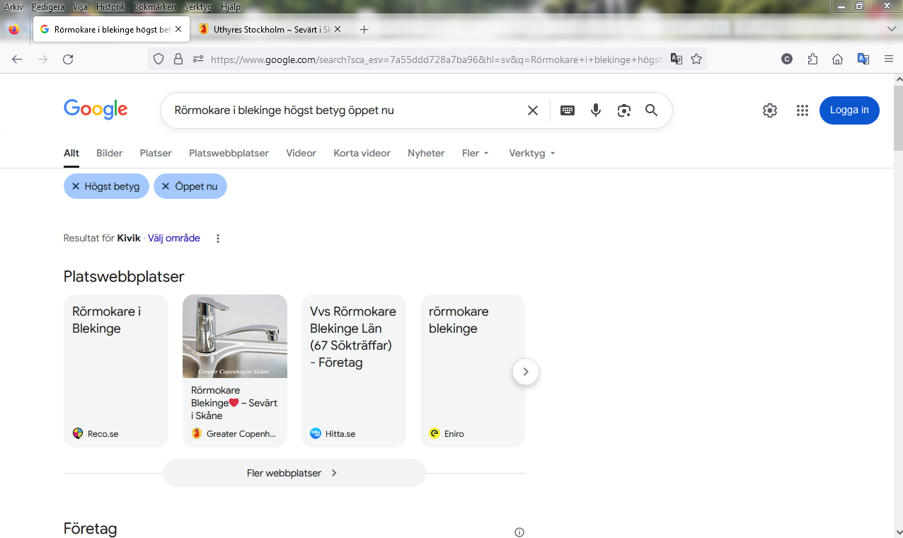 Några exempel på sökning i Blekinge med högst betyg + öppet nu + onlineofferter (med Google filter)