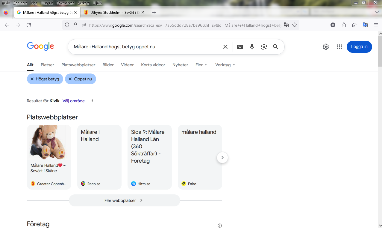 Några exempel på sökning i Halland med högst betyg + öppet nu + onlineofferter (med Google filter)