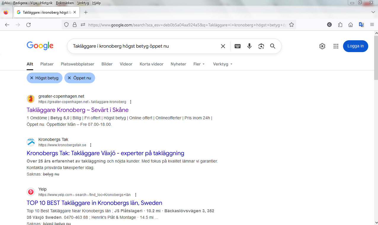 Några exempel på sökning i Kronoberg med högst betyg + öppet nu + onlineofferter (med Google filter)