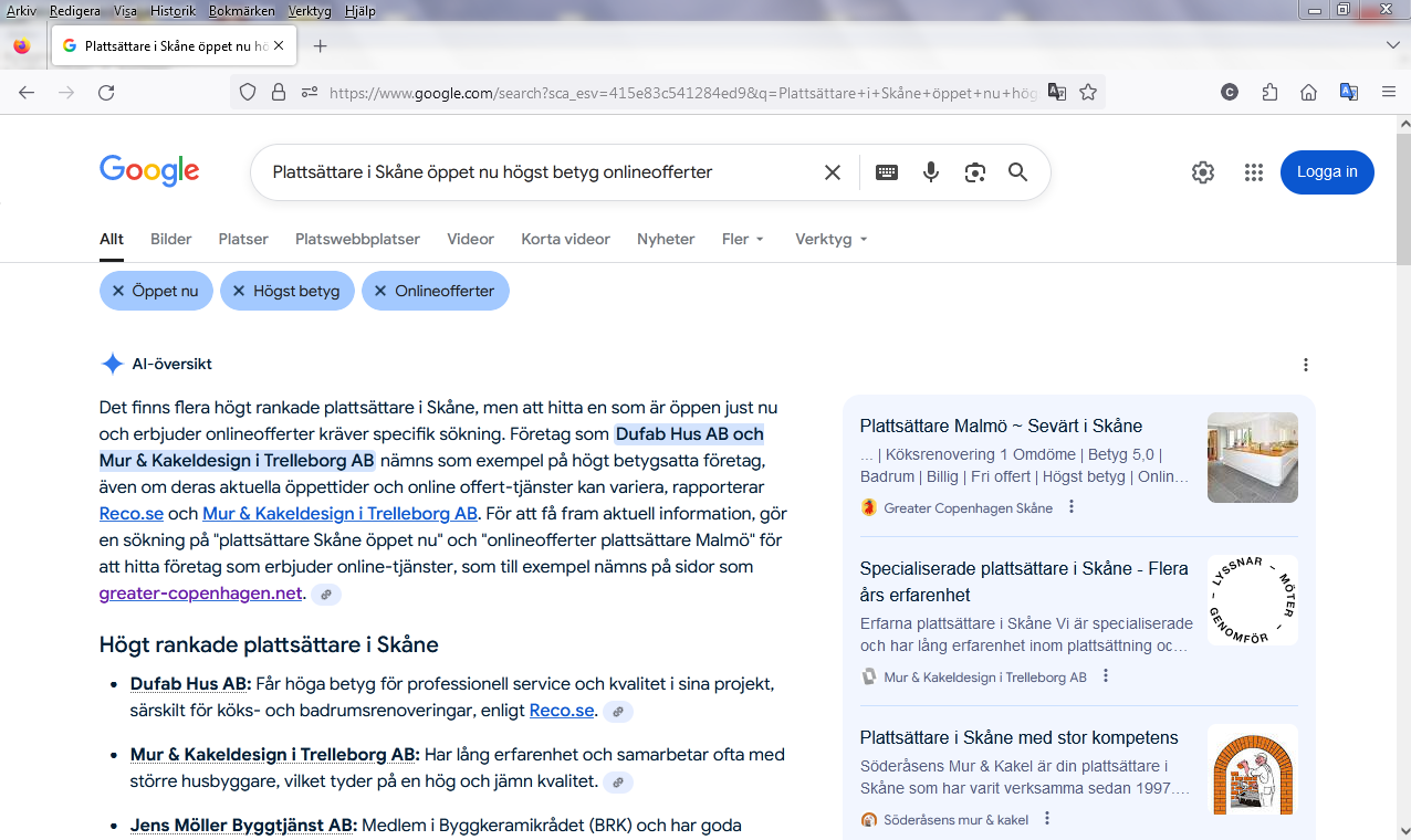 Nr: 3 är exempel på sökning byggfirma i (förvald ort) med högst betyg + öppet nu + onlineofferter + bilder